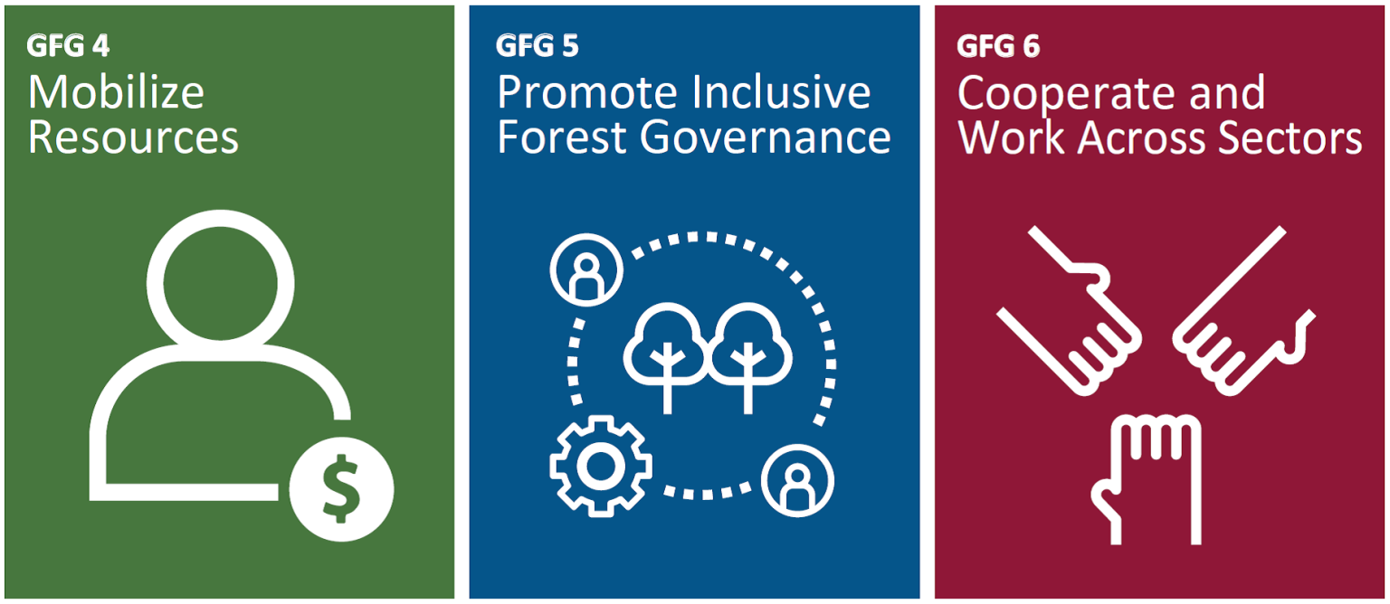 - Mempromosikan kerangka tata kelola untuk menerapkan pengelolaan hutan lestari, termasuk melalui instrumen hutan PBB, dan meningkatkan kontribusi hutan pada Agenda 2030 untuk Pembangunan Berkelanjutan.